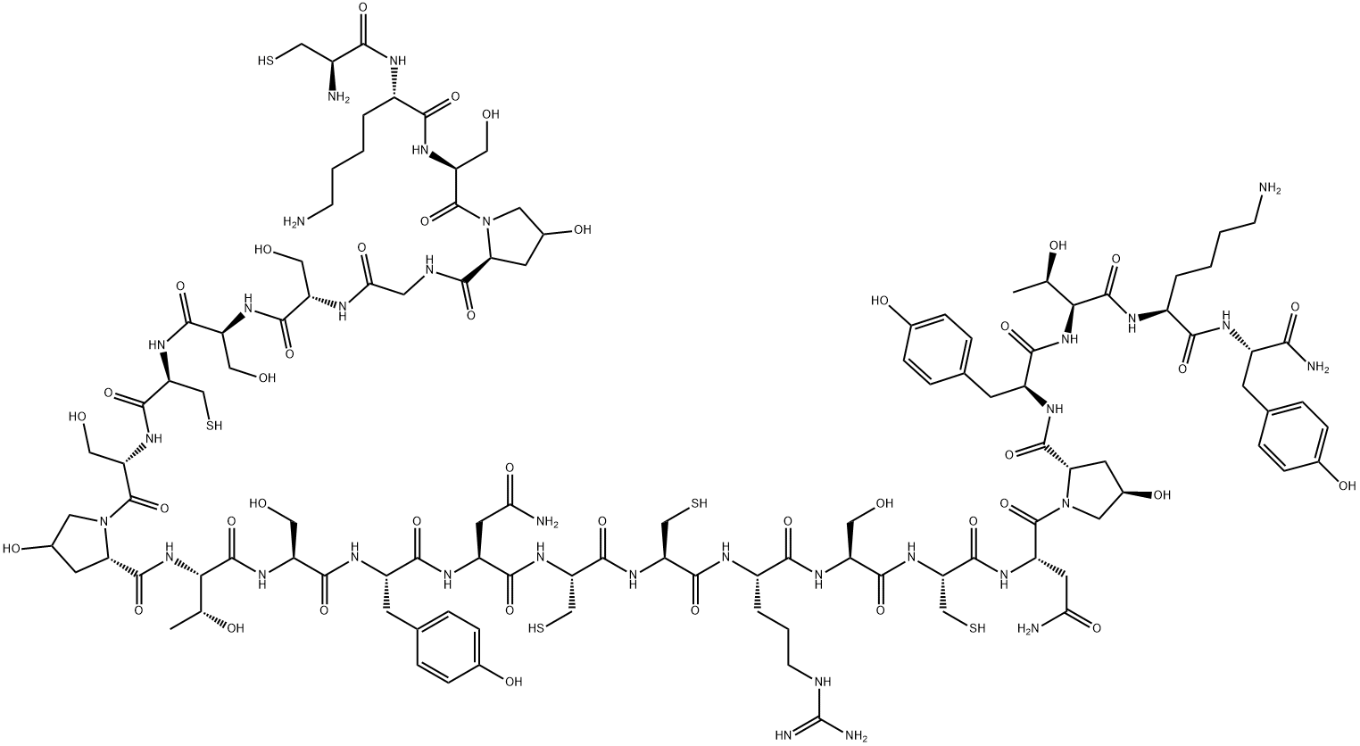 模块2. 危险性概述 2.1 GHS分类 根据化学品全球统一分类与标签制度(GHS)的规定,不是危险物质或混合物。 2.3 其它危害物 - 无 模块3. 成分/组成信息 3.1 物 质 : C120H182N38O43S6 分子式 : 3,037.35 g/mol 分子量 无 模块4. 急救措施 4.1 必要的急救措施描述 吸入 如果吸入,请将患者移到新鲜空气处。 如果停止了呼吸,给于人工呼吸。 皮肤接触 用肥皂和大量的水冲洗。 眼睛接触 用水冲洗眼睛作为预防措施。 食入 切勿给失去知觉者从嘴里喂食任何东西。 用水漱口。 4.2 主要症状和影响,急性和迟发效应 据我们所知,此化学,物理和毒性性质尚未经完整的研究。 4.3 及时的医疗处理和所需的特殊处理的说明和指示 无数据资料 模块5. 消防措施 5.1 灭火介质 灭火方法及灭火剂 用水雾,耐醇泡沫,干粉或二氧化碳灭火。 5.2 源于此物质或混合物的特别的危害 碳氧化物, 氮氧化物, 硫氧化物 5.3 给消防员的建议 如必要的话,戴自给式呼吸器去救火。 5.4 进一步信息 无数据资料 模块6. 泄露应急处理 6.1 人员的预防,防护设备和紧急处理程序 防止粉尘的生成。 防止吸入蒸汽、气雾或气体。 6.2 环境保护措施 不要让产物进入下水道。 6.3 抑制和清除溢出物的方法和材料 扫掉和铲掉。 存放进适当的闭口容器中待处理。 6.4 参考其他部分 丢弃处理请参阅第13节。 模块7. 操作处置与储存 7.1 安全操作的注意事项 在有粉尘生成的地方,提供合适的排风设备。一般性的防火保护措施。 7.2 安全储存的条件,包括任何不兼容性 贮存在阴凉处。 容器保持紧闭,储存在干燥通风处。 建议的贮存温度: -20 °C 7.3 特定用途 无数据资料 模块8. 接触控制和个体防护 8.1 容许浓度 最高容许浓度 没有已知的国家规定的暴露极限。 8.2 暴露控制 适当的技术控制 常规的工业卫生操作。 个体防护设备 眼/面保护 请使用经官方标准如NIOSH (美国) 或 EN 166(欧盟) 检测与批准的设备防护眼部。 皮肤保护 所选择的保护手套必须符合EU的89/686/EEC规定和从它衍生出来的EN 376标准。 戴手套取 手套在使用前必须受检查。 请使用合适的方法脱除手套(不要接触手套外部表面),避免任何皮肤部位接触此产品. 使用后请将被污染过的手套根据相关法律法规和有效的实验室规章程序谨慎处理. 请清洗并吹干双手 身体保护 根据危险物质的类型,浓度和量,以及特定的工作场所来选择人体保护措施。, 防护设备的类型必须根据特定工作场所中的危险物的浓度和含量来选择。 呼吸系统防护 不需要保护呼吸。如需防护粉尘损害,请使用N95型(US)或P1型(EN 143)防尘面具。 呼吸器使用经过测试并通过政府标准如NIOSH(US)或CEN(EU)的呼吸器和零件。 模块9. 理化特性 9.1 基本的理化特性的信息 a) 外观与性状 形状: 固体 b) 气味 无数据资料 c) 气味阈值 无数据资料 d) pH值 无数据资料 e) 熔点/凝固点 无数据资料 f) 起始沸点和沸程 无数据资料 g) 闪点 无数据资料 h) 蒸发速率 无数据资料 i) 易燃性(固体,气体) 无数据资料 j) 高的/低的燃烧性或爆炸性限度 无数据资料 k) 蒸汽压 无数据资料 l) 蒸汽密度 无数据资料 m) 相对密度 无数据资料 n) 水溶性 无数据资料 o) n-辛醇/水分配系数 无数据资料 p) 自燃温度 无数据资料 q) 分解温度 无数据资料 r) 粘度 无数据资料 模块10. 稳定性和反应活性 10.1 反应性 无数据资料 10.2 稳定性 无数据资料 10.3 危险反应的可能性 无数据资料 10.4 应避免的条件 无数据资料 10.5 不兼容的材料 强氧化剂 10.6 危险的分解产物 其它分解产物 - 无数据资料 模块11. 毒理学资料 11.1 毒理学影响的信息 急性毒性 无数据资料 TDLo 大脑内的 - 老鼠 - 0.002 mg/kg 备注: 行为的:痛觉缺失 皮肤刺激或腐蚀 无数据资料 眼睛刺激或腐蚀 无数据资料 呼吸道或皮肤过敏 长期或反复接触导致个别人过敏反应 生殖细胞突变性 无数据资料 致癌性 IARC: 此产品中没有大于或等于 0。1%含量的组分被 IARC鉴别为可能的或肯定的人类致癌物。 生殖毒性 无数据资料 特异性靶器官系统毒性(一次接触) 无数据资料 特异性靶器官系统毒性(反复接触) 无数据资料 吸入危险 无数据资料 潜在的健康影响 吸入吸入可能有害。 可能引起呼吸道刺激。 摄入如服入是有害的。 皮肤如果通过皮肤吸收可能是有害的。 可能引起皮肤刺激。 眼睛可能引起眼睛刺激。 接触后的征兆和症状 据我们所知,此化学,物理和毒性性质尚未经完整的研究。 附加说明 化学物质毒性作用登记: GL2665050 模块12. 生态学资料 12.1 生态毒性 无数据资料 12.2 持久存留性和降解性 无数据资料 12.3 潜在的生物蓄积性 无数据资料 12.4 土壤中的迁移性 无数据资料 12.5 PBT 和 vPvB的结果评价 无数据资料 12.6 其它不利的影响 无数据资料 模块13. 废弃处置 13.1 废物处理方法 产品 将剩余的和未回收的溶液交给处理公司。 受污染的容器和包装 作为未用过的产品弃置。 模块14. 运输信息 14.1 联合国危险货物编号 欧洲陆运危规: -国际海运危规: -国际空运危规: - 14.2 联合国(UN)规定的名称 欧洲陆运危规: 非危险货物 国际海运危规: 非危险货物 国际空运危规: 非危险货物 14.3 运输危险类别 欧洲陆运危规: -国际海运危规: -国际空运危规: - 14.4 包裹组 欧洲陆运危规: -国际海运危规: -国际空运危规: - 14.5 环境危险 欧洲陆运危规: 否国际海运危规 海运污染物: 否国际空运危规: 否 14.6 对使用者的特别提醒