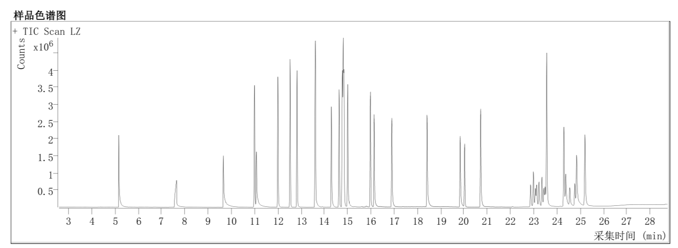 2、氯氰菊酯(CAS No. :52315-07-8)出4个峰,出峰时间为22.857min,22.978min,23.067min和23.118min。