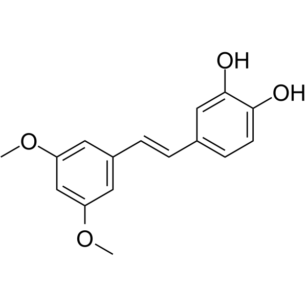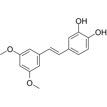 3'-Hydroxypterostilbene,一种天然紫檀芪类似物,通过诱导细胞凋亡 (apoptosis) 和自噬 (autophagy),有效抑制人结肠癌细胞的生长 (对 COLO 205,HCT-116 和 HT-29 细胞的 IC50 分别为 9.0,40.2 和 70.9 μM)。3'-Hydroxypterostilbene 抑制 PI3K/Akt/mTOR/p70S6K 和 p38MAPK 途径并激活 ERK1/2,JNK1/2 MAPK途径。