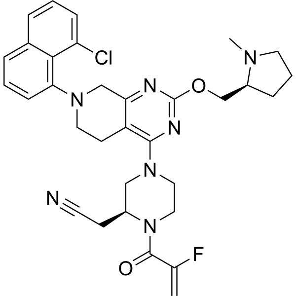 Adagrasib (MRTX849) 是一种有效,口服可用,突变选择性的 KRAS G12C 共价抑制剂,具有潜在抗肿瘤活性的。Adagrasib 在半胱氨酸 12 残基处与 KRAS G12C 共价结合,将蛋白锁定在非活性的 GDP 结合构象中,并抑制 KRAS 依赖性信号转导。