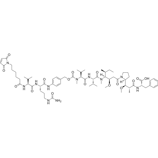 | 生物活性 | MC-Val-Cit-PAB-MMAF (Vc-MMAF) is a agent-linker conjugate for ADC by using the tubulin inhibitor, MMAF, linked via cathepsin cleavable MC-Val-Cit-PAB. MC-Val-Cit-PAB-MMAF shows antitumor activity. | ||||||||||||||||
