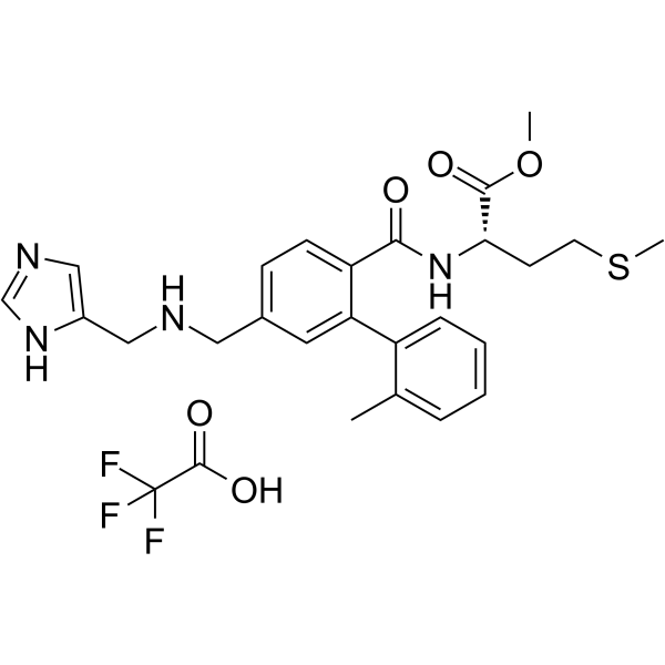 | 产品介绍 | FTI-2153 TFA 是一种有效、高度选择性的法尼基转移酶 farnesyltransferase (FTase) 抑制剂,IC50 为 1.4 nM。FTI-2153 TFA 有效抑制 H-Ras 蛋白的加工修饰,IC50 值为 10 nM,是对其抑制活性是对 Rap1A 蛋白加工的 3000 多倍。 | ||||||||||||||||