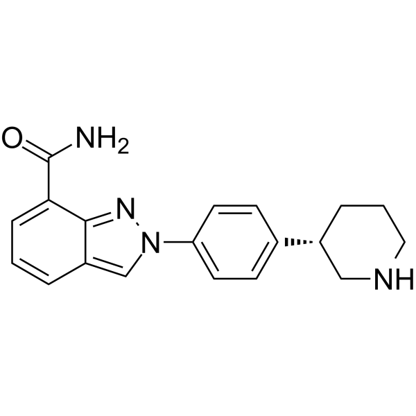 Niraparib (MK-4827) 是高效的 PARP1 和 PARP2 抑制剂,IC50 分别为 3.8 nM 和 2.1 nM。
