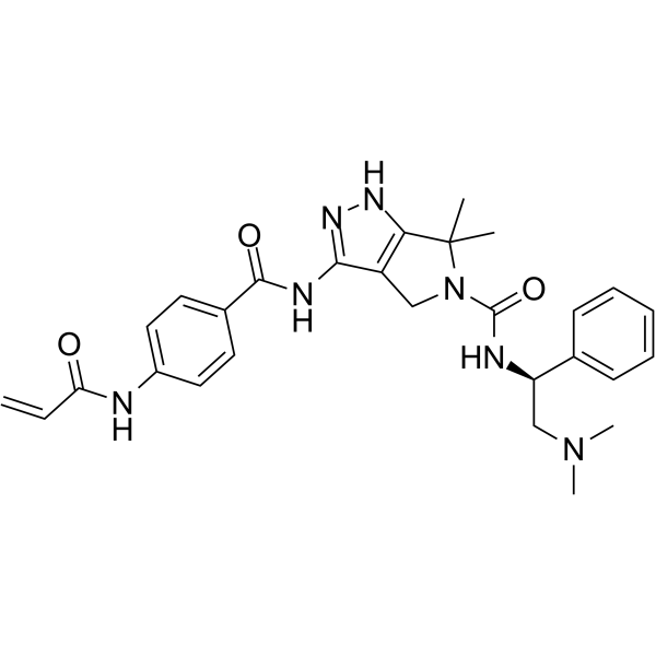 | 生物活性 | YKL-5-124 is a potent, selective, irreversible and covalent CDK7 inhibitor with IC50s of 53.5 nM and 9.7 nM for CDK7 and CDK7/Mat1/CycH, respectively. YKL-5-124 is >100-fold greater selective for CDK7 than CDK9 and CDK2, and inactive against CDK12 and CDK13. YKL-5-124 induces a strong cell-cycle arrest, inhibits E2F-driven gene expression, and exhibits little effect on RNA polymerase II phosphorylation status. | ||||||||||||||||