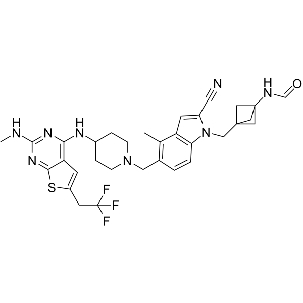 MI-3454 是一种具有口服活性,高效和选择性的 Menin-MLL1 相互作用抑制剂,IC50 为 0.51 nM。MI-3454 通过下调涉及白血病发生的关键基因,在 MLL1 重排或 NPM1 突变的白血病小鼠模型中抑制细胞增殖,诱导分化并完全缓解或消退白血病。