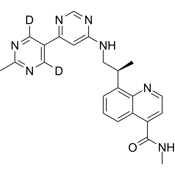 VX-984 is an orally active, potent, selective and BBB-penetrated DNA-PK inhibitor. VX-984 efficiently inhibits NHEJ (non-homologous end joining) and increases DSBs (DNA double-strand breaks). VX-984 can be used for glioblastomas (GBM) and non-small cell lung cancer (NSCLC) research. VX-984 is a de novo deuterium.