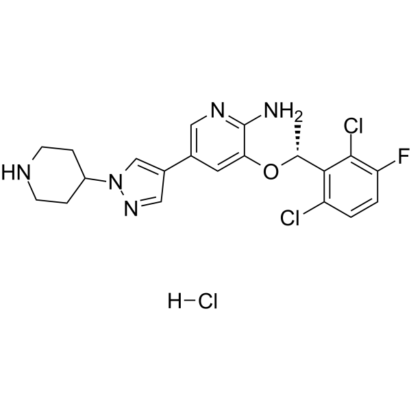 Crizotinib hydrochloride 是有效的 c-Met 和 ALK 抑制剂,在细胞试验中,IC50 值分别为 11 nM 和 24 nM。