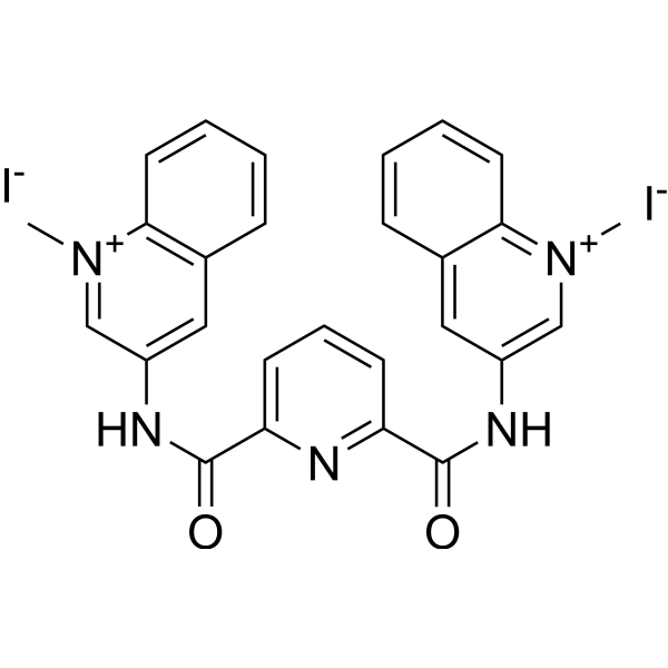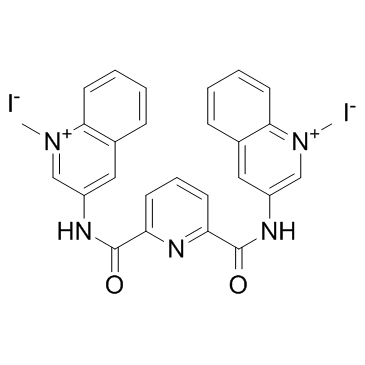 360A iodide 是一种 G-四联体 (G-quadruplex) 的稳定剂,同时可抑制端粒酶 (telomerase) 的活性,在 TRAP-G4 实验中,IC50 值为 300 nM。