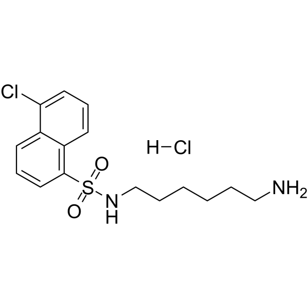 | 生物活性 | W-7 hydrochloride is a selective calmodulin antagonist. W-7 hydrochloride inhibits the Ca2+-calmodulin-dependent phosphodiesterase and myosin light chain kinase with IC50 values of 28 μM and 51 µM, respectively. W-7 hydrochloride induces apoptosis and has antitumor activity. | ||||||||||||||||