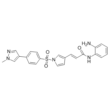 | 生物活性 | Domatinostat (4SC-202 free base) is a selective class I HDAC inhibitor with IC50 of 1.20 μM, 1.12 μM, and 0.57 μM for HDAC1, HDAC2, and HDAC3, respectively. It also displays inhibitory activity against Lysine specific demethylase 1 (LSD1). | ||||||||||||||||