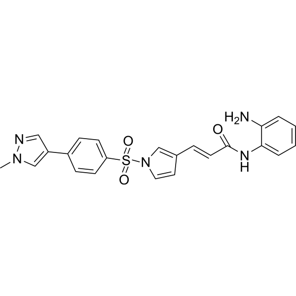 Domatinostat (4SC-202 free base) 是一种 I 型 HDAC 抑制剂,能够抑制 HDAC1,HDAC2,和 HDAC3 的活性,IC50 值分别为 1.20 μM,1.12 μM 和 0.57 μM;同时能够抑制组蛋白赖氨酸特异性脱甲基酶1 (Lysine specific demethylase 1) 的活性。