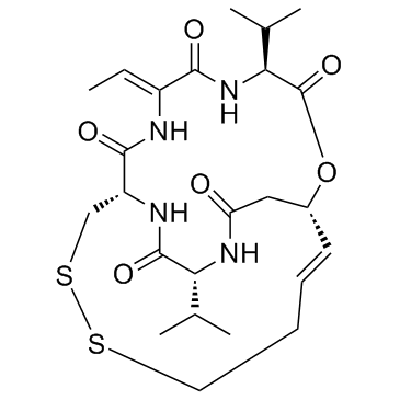 | 生物活性 | Romidepsin (FK 228) is a Histone deacetylase (HDAC) inhibitor with anti-tumor activities. Romidepsin (FK 228) inhibits HDAC1, HDAC2, HDAC4, and HDAC6 with IC50s of 36 nM, 47 nM, 510 nM and 1.4 μM, respectively. Romidepsin (FK 228) is produced by Chromobacterium violaceum, induces cell G2/M phase arrest and apoptosis. | ||||||||||||||||||||||||