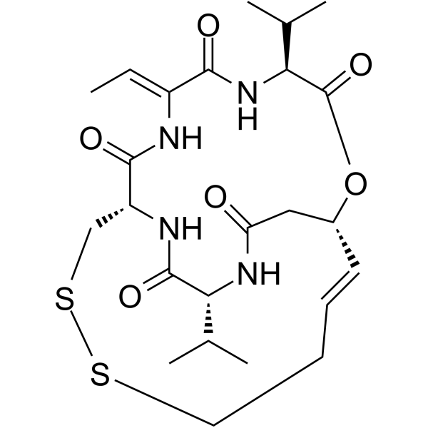 Romidepsin 是一种有效的 HDAC1 和 HDAC2 抑制剂,IC50 值分别为 36 nM 和 47 nM。