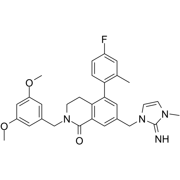 | 生物活性 | WDR5-IN-1 is a potent and selective WD repeat domain 5 (WDR5) inhibitor, with a Kd of <0.02 nM. WDR5-IN-1 inhibits MLL1 histone methyltransferase (HMT) activity with an IC50 of 2.2 nM. WDR5-IN-1 diminishes MYC recruitment at WDR5-displaced genes and exhibits potent anti-proliferative effects in CHP-134 (neuroblastoma) and Ramos (Burkitt’s lymphoma) lines. | ||||||||||||||||