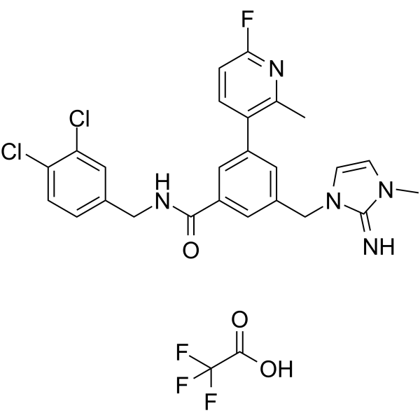 | 产品介绍 | WDR5-IN-4 TFA 是一种染色质相关 WD 重复结构域 5 蛋白 (WDR5) 的 WIN 位点抑制剂,Kd 值为 0.1 nM。WDR5-IN-4 TFA 能够从染色质中取代 WDR5,并降低相关基因的表达,引起翻译抑制和核仁应激。具有抗癌作用。 | ||||||||||||||||