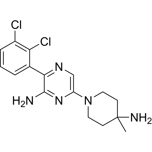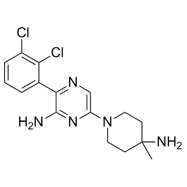 The X-ray co-crystal for SHP099 with SHP2 reveals a new interaction with the basic amine and the Phe113 backbone carbonyl. SHP099 shows inhibition of cell proliferation (KYSE-520 model) with an IC50 of 1.4 μM. SHP099 shows high solubility and high permeability with no apparent efflux in Caco-2 cells. SHP099 concurrently binds to the interface of the N-terminal SH2, C-terminal SH2, and protein tyrosine phosphatase domains, thus inhibiting SHP2 activity through an allosteric mechanism. SHP099 suppresses RAS–ERK signalling to inhibit the proliferation of receptor-tyrosine-kinase-driven human cancer cells. 西域 has not independently confirmed the accuracy of these methods. They are for reference only. | ||||||||||||||||