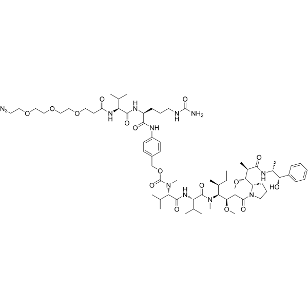 | 生物活性 | N3-PEG3-vc-PAB-MMAE is a synthesized agent-linker conjugate for ADC that incorporates the MMAE (a tubulin inhibitor ) and 3-unit PEG linker. N3-PEG3-vc-PAB-MMAE shows potent antitumor activity. | ||||||