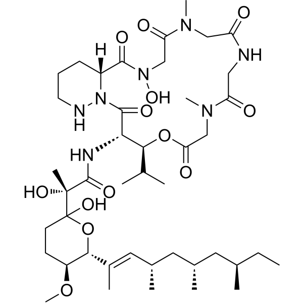 ATP6V1G, a subunit of the vacuolar H+-ATPase (v-ATPase).Verucopeptin (0-30 μM; 72 h) shows excellent antitumor activity against K562R cells, with an IC50 of 388 nM, although these cells exhibit resistance to some other chemotherapeutic agents, such as Taxol and vincristine at concentrations of 10 μM. Verucopeptin (0-1 μM) shows broad antiproliferative activity, with IC50 values of less than 100 nM against 66% of the cell lines evaluated among a total of 1,094 cancer cell lines. Moreover,Verucopeptin displays tissue specificity, such as leukemia, lymphoma, and melanoma, are classified in the lower IC50 groups, while the higher IC50 groups including other cancer types, such as non-small cell lung cancer.Verucopeptin (10 nM; 1 hour) pretreatment blocks VE-P labeling of ATP6V1G1 but not ATP1V1B2 or ATP6V1D in a competitive binding assay. Verucopeptin shows substantial inhibition of v-ATPase activity and suppresses lysosomal acidification in vitro, as does Baf A1, although to a lesser extent.Verucopeptin (0-500 nM; 1 hour) exhibits substantial inhibition of p-S6K as well as p-4EBP1 at concentrations of 10-200 nM. Additionally, Verucopeptin attenuates the phosphorylation of most of the tested mTORC1 downstream substrates, including p-4EBP1, pmTORS2448, p-mTORS2481, p-Rictor, p-ULK1, and p-Grb10, at concentrations ranging from 50 nM to 500 nM.Verucopeptin (0-335 nM; 24 hour) decreases the HIF-1 protein level in a dose-dependent manner but has no effects on c-Raf in HT1080 cells. However, the known hsp90 inhibitor Tanespimycin (HY-10211) inhibits both HIF-1 and c-Raf expression in cells. 西域 has not independently confirmed the accuracy of these methods. They are for reference only. | ||||||||