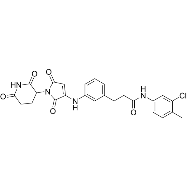| 生物活性 | ALV1 potently induces degradation of both Ikaros and Helios without unexpected off-target activity. ALV1 binds CRBN with IC50 of 0.55 µM. ALV1 degrades cells stably expressing IKZF1Δ and IKZF2Δ GFP fusions with mCherry reporter with DC50s of 2.5 and 10.3 nM. | ||||||||||||||||
