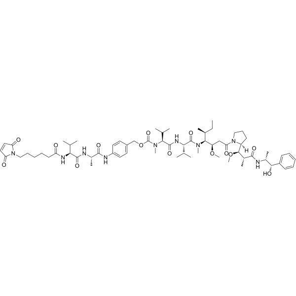 | 产品介绍 | MC-VA-PABC-MMAE 是抗体偶联活性分子 ADC 的一部分。MC-VA-PABC-MMAE 由 ADC linker (peptide MC-VA-PABC) 和强效微管蛋白聚合抑制剂 MMAE (HY-15162) 偶联而成。 | ||||||||||||||||