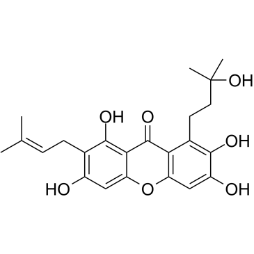 Garcinone C 是一种呫吨酮 (xanthone) 衍生物,是从长叶藤 (Garcinia oblongifolia Champ) 中提取的天然化合物,用作抗炎,镇痛,涩味和促进成粒的药物,对某些癌症具有潜在的细胞毒作用。Garcinone C 刺激 ATR 和 4E-BP1 的表达水平,同时有效抑制细胞周期蛋白 B1,细胞周期蛋白 D1,细胞周期蛋白 E2,cdc2,Stat3 和 CDK7 的表达水平。Garcinone C 以时间和剂量依赖性方式显着抑制人鼻咽癌 (NPC) 细胞系 CNE1,CNE2,HK1 和 HONE1 的细胞活力。