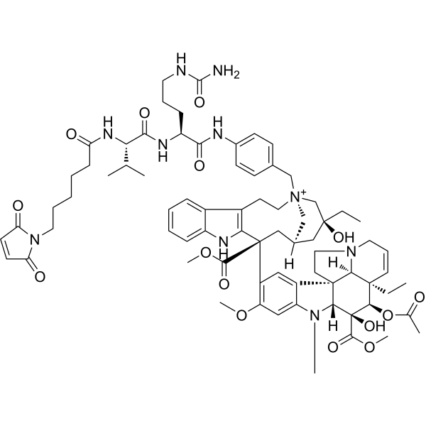 | 产品介绍 | MC-Val-Cit-PAB-vinblastine 是抗体偶联活性分子的一部分,由微管蛋白抑制剂 vinblastine 和 ADC linker MC-Val-Cit-PAB 连接而成。 |