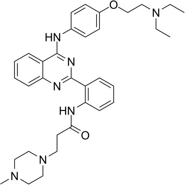 | 产品介绍 | hVEGF-IN-1,一种喹唑啉衍生物,可以特异性结合内部核糖体进入位点 A (IRES-A) 中富含 G 的序列,并会使 G-四链体结构不稳定。在 SPR 实验中,hVEGF-IN-1 以 0.928 μM 的 Kd 值与 IRES-A (WT) 结合。hVEGF-IN-1 可通过降低 VEGF-A 蛋白表达来阻止肿瘤细胞迁移并抑制肿瘤生长。 | ||||||||||||||||