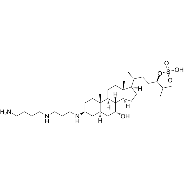 | 生物活性 | Squalamine(MSI-1256) is an aminosterol compound with potent broad spectrum antiviral activity. IC50 value: Target: in vitro: squalamine can strongly displace membrane-bound cationic proteins such as Rac1, a ρ-GTPase recruited to the inner leaflet of the eukaryotic cytoplasmic membrane for the actin remodeling necessary for endocytosis. At concentrations between 20 and 60 μg/mL, squalamine has been shown to inhibit a broad array of growth factor-induced, actin-dependent responses in endothelial cells, including cell migration, cell division, and vascular tube formation in a 3D matrix . Squalamine effectively inhibited HBV replication in human primary hepatocytes when added either during the initial exposure of virus to the cells or at 24 h after infection. A similar study was performed to evaluate the effect of squalamine on the replication of HDV. Squalamine was introduced at 20 μg/mL during HDV exposure, and the effects were measured at day 7 when total RNA was extracted and assayed for HDV RNA sequences . in vivo: one time daily treatment with squalamine (15 or 30 mg/kg per d s.c.) was started beginning on day 1 or 2 after viral administration and continuing until day 8 or 9, respectively. Survival was monitored, and animals that remained alive by day 21 were considered cured . | ||||||||||||||||