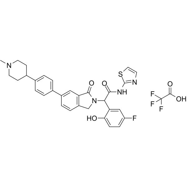 | 生物活性 | JBJ-09-063 TFA is a mutant-selective allosteric EGFR inhibitor with IC50s of 0.147 nM, 0.063 nM, 0.083 nM and 0.396 nM for EGFR L858R, EGFR L858R/T790M, EGFR L858R/T790M/C797S and EGFRLT/L747S. JBJ-09-063 TFA effectively reduces EGFR, Akt and ERK1/2 phosphorylation. JBJ-09-063 TFA is effective across EGFR tyrosine kinase inhibitor (TKI)-sensitive and resistant models. JBJ-09-063 TFA can be used for researching EGFR-mutant lung cancer. | ||||||||||||||||||