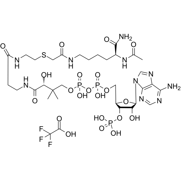 | 生物活性 | Lys-CoA TFA is a selective p300 histone acetyltransferase (HAT) inhibitor (IC50=50-500 nM). Lys-CoA TFA displays >100-fold selectivity for p300 over PCAF (IC50=200 μM). Lys-CoA TFA inhibits p300 HAT activity-dependent transcriptional activation. | ||||||||||||||||