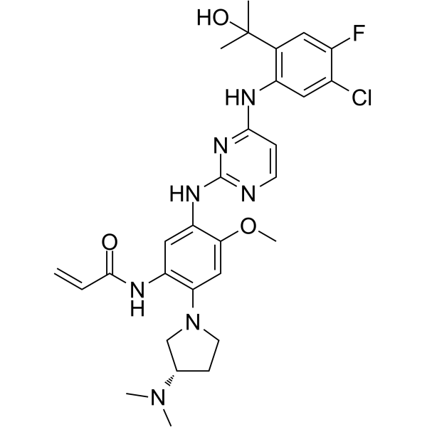 | 生物活性 | (S)-Sunvozertinib ((S)-DZD9008), the S-enantiomer of Sunvozertinib, shows inhibitory activity against EGFR exon 20 NPH and ASV insertions, EGFR L858R/T790M mutation and Her2 exon20 YVMA insertion (IC50=51.2 nM, 51.9 nM, 1 nM, and 21.2 nM, respectively). (S)-Sunvozertinib also inhibits BTK. | ||||||||||||||||
