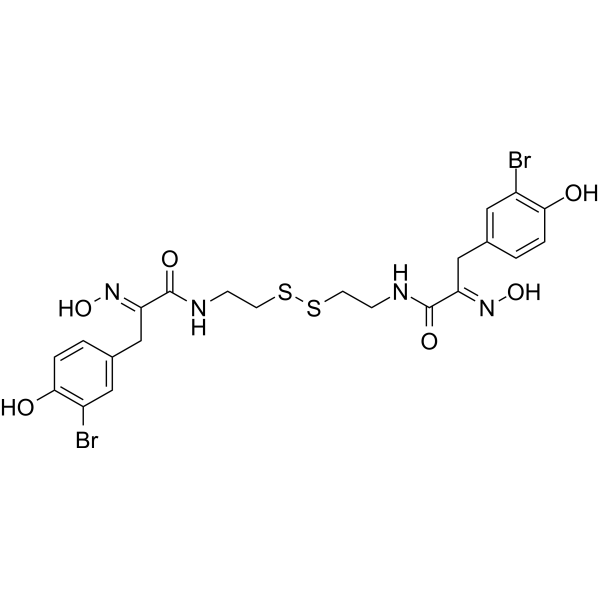 | 产品介绍 | Psammaplin A 是一种海洋代谢产物,是 HDAC 和 DNA 甲基转移酶 (DNA methyltransferases) 的有效抑制剂。Psammaplin A 是一种高效的选择性 HDAC1 抑制剂,IC50 为 0.9 nM,对 HDAC1 的选择性是 DAC6 的 360 倍,对 HDAC7 和 HDAC8 的效力低 1000 倍以上。Psammaplin A 对革兰氏阳性细菌 (Gram-positive bacteria) 具有抗菌作用,并抑制 DNA 合成和 DNA 促旋酶 (DNA gyrase) 活性。抗肿瘤活性。 |