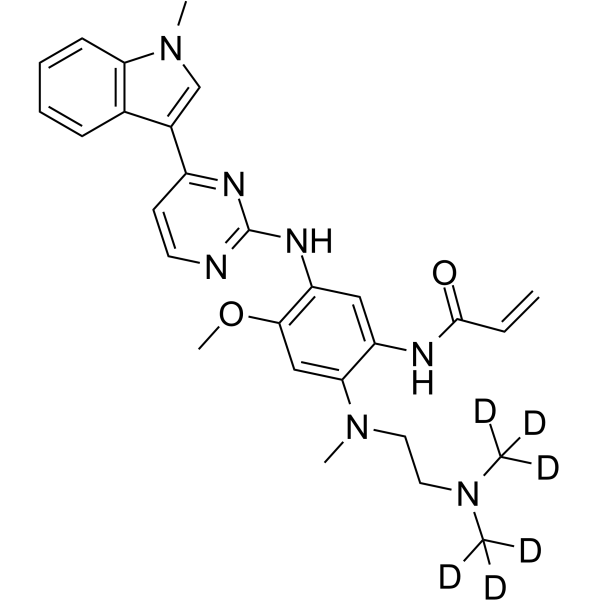 | 生物活性 | Osimertinib-d6 is a deuterium labeled osimertinib. Osimertinib is a covalent, orally active, irreversible, and mutant-selective EGFR inhibitor with an apparent IC50 of 12 nM against L858R and 1 nM against L858R/T790M. Osimertinib overcomes T790M-mediated resistance to EGFR inhibitors in lung cancer. | ||||||||||||||||||||||||||||||||