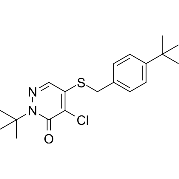| 生物活性 | Pyridaben is a mitochondrial electron transport inhibitor (METI) acaricide that promotes the formation of damaging oxygen and nitrogen radicals. Pyridaben selectively inhibits complex I (NADH dehydrogenase) with an IC50 value of 2.4 nM (assay sites: rat liver and bovine heart mitochondria). Pyridaben also significantly inhibits rat mitochondrial mtNOS function. | ||||||||||||||||