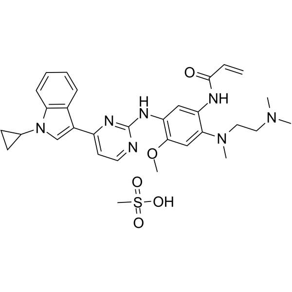 | 生物活性 | Almonertinib (HS-10296) mesylate is an orally available, irreversible, third-generation EGFR tyrosine kinase inhibitor with high selectivity for EGFR-sensitizing and T790M resistance mutations. Almonertinib mesylate shows great inhibitory activity against T790M, T790M/L858R and T790M/Del19 (IC50: 0.37, 0.29 and 0.21 nM, respectively), and is less effective against wild type (3.39 nM). Almonertinib mesylate is used for the research of the non-small cell lung cancer. | ||||||||||||||||