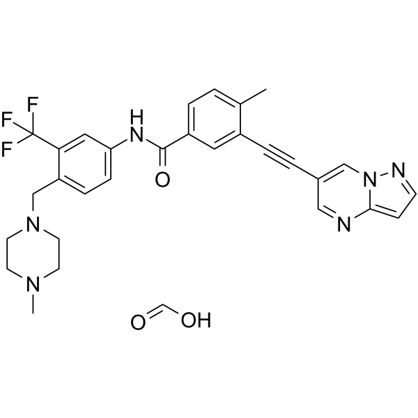 GZD856 formic 是一种有效的和具有口服活性的 PDGFRα/β 抑制剂,IC50 值分别为 68.6 和 136.6 nM。GZD856 formic 也是 Bcr-AblT315I 的抑制剂,对天然 Bcr-Abl 和 T315I 突变型的 IC50 值分别为 19.9 和 15.4 nM。GZD856 formic 具有抗肿瘤活性。