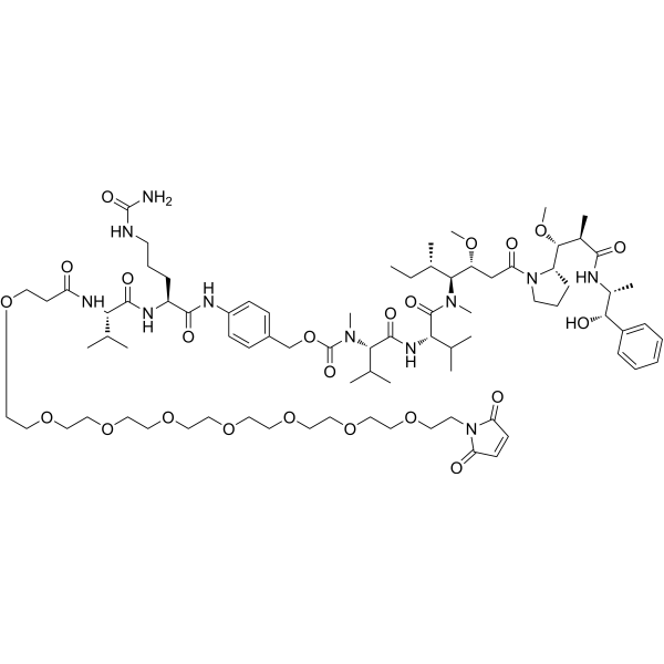 | 生物活性 | Mal-PEG8-Val-Cit-PAB-MMAE is a agent-linker conjugate for ADC. Mal-PEG8-Val-Cit-PAB-MMAE contains a cleavable ADC linker and a potent tubulin inhibitor MMAE (HY-15162). | ||||||||||||||||