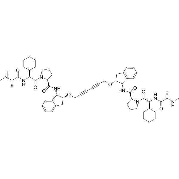 | 生物活性 | AZD5582 is an antagonist of the inhibitor of apoptosis proteins (IAPs), which binds to the BIR3 domains cIAP1, cIAP2, and XIAP with IC50s of 15, 21, and 15 nM, respectively. AZD5582 induces apoptosis. | ||||||||||||||||||||||||