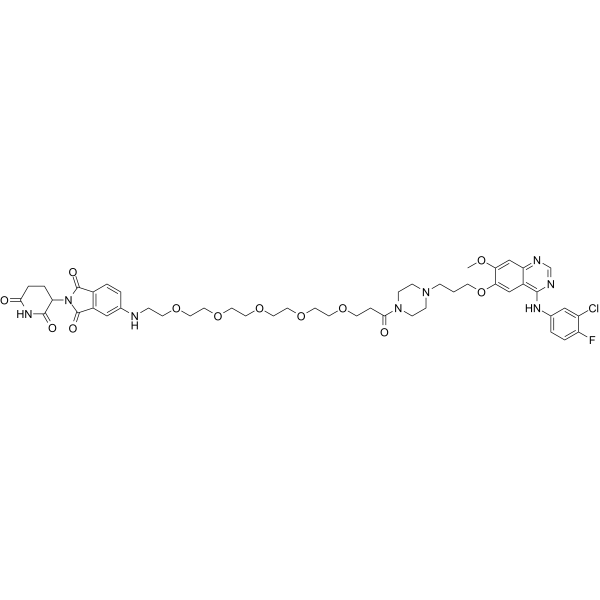 | 生物活性 | MS9427 is a potent PROTAC EGFR degrader with Kds of 7.1 nM and 4.3 nM for EGFR WT and EGFR L858R, respectively. MS9427 selectively degrades the mutant but not the WT EGFR through both the ubiquitin/proteasome system (UPS) and autophagy/lysosome pathways. MS9427 potently inhibits the proliferation of NSCLC cells. MS9427 can be used for researching anticancer. | ||||||||||||||||