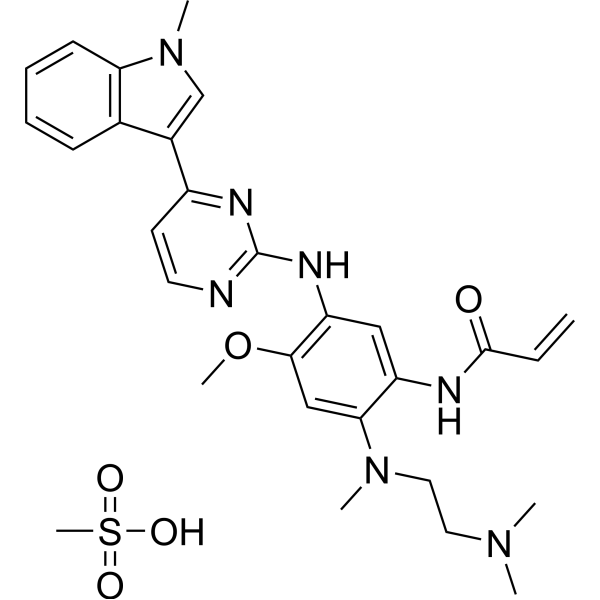 | 生物活性 | Osimertinib mesylate (AZD9291 mesylate) is a covalent, orally active, irreversible, and mutant-selective EGFR inhibitor with an apparent IC50 of 12 nM against L858R and 1 nM against L858R/T790M. Osimertinib overcomes T790M-mediated resistance to EGFR inhibitors in lung cancer. | ||||||||||||||||||||||||||||||||