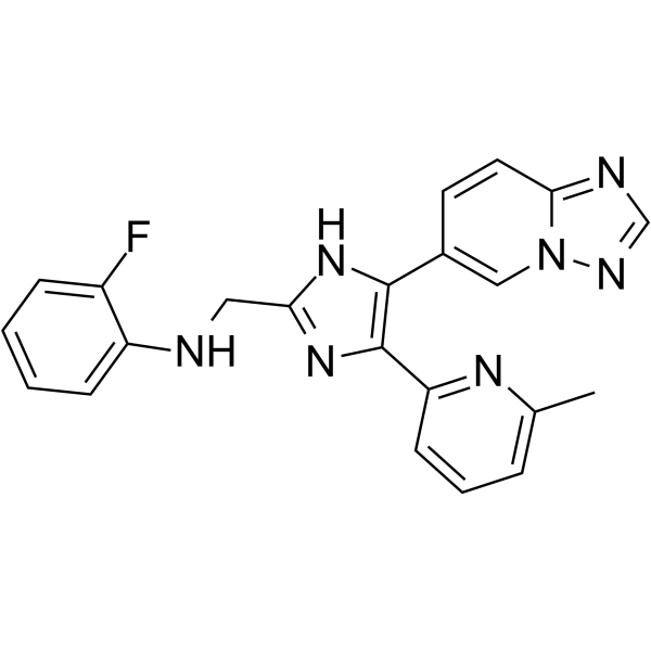 Vactosertib (EW-7197) 是 ALK5 的 ATP 竞争性抑制剂,IC50 为 12.9 nM。抑制 ALK2 和 ALK4 在纳摩尔级别。