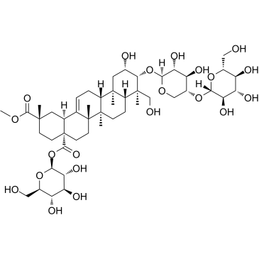 | 产品介绍 | Esculentoside H (EsH) 是从多年生植物 Phytolacca esculent 的根提取物中分离的一种皂苷。 Esculentoside H (EH) 具有抗肿瘤活性,其机制与 TNF 释放能力有关。 Esculentoside H (EsH) 通过阻断 JNK1/2 和 NF-κB 信号介导的基质金属蛋白酶-9 (MMP-9) 表达抑制结肠癌细胞迁移。 | ||||||||||||||||