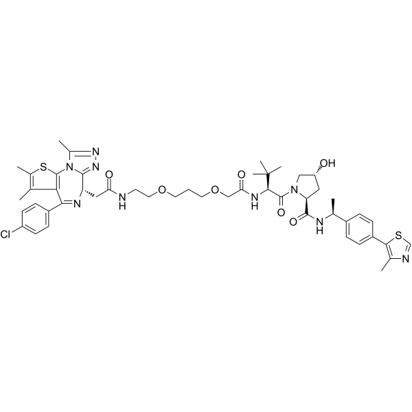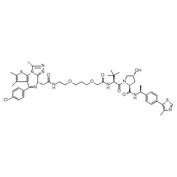 | 生物活性 | ARV-771 is a potent BET PROTAC based on E3 ligase von Hippel-Lindau with Kds of 34 nM, 4.7 nM, 8.3 nM, 7.6 nM, 9.6 nM, and 7.6 nM for BRD2(1), BRD2(2), BRD3(1), BRD3(2), BRD4(1), and BRD4(2), respectively. | ||||||||||||||||