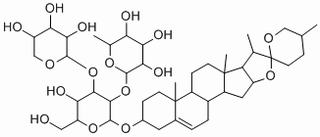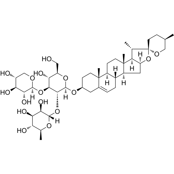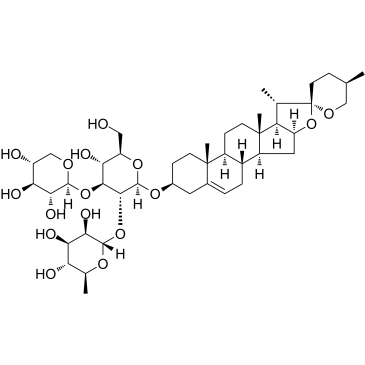 Ophiopogonin D' 是从麦冬 (Ophiopogon japonicus) 的块茎中分离的,是一种罕见的天然存在的 C29 甾体糖苷。Ophiopogonin D' 针对两种人肿瘤细胞系 MG-63 和 SNU387 的有细胞毒活性,IC50 分别为 3.09 μM 和 3.63 μM。Ophiopogonin D' 以剂量依赖方式激活 SIRT1。