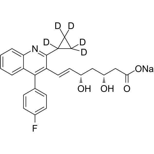 | 生物活性 | Pitavastatin-d5 (sodium) is the deuterium labeled Pitavastatin sodium. Pitavastatin (NK-104) is a potent hydroxymethylglutaryl-CoA (HMG-CoA) reductase inhibitor. Pitavastatin inhibits cholesterol synthesis from acetic acid with an IC50 of 5.8 nM in HepG2 cells. Pitavastatin is an efficient hepatocyte low-density lipoprotein-cholesterol (LDL-C) receptor inducer. Anti-cancer activity. |