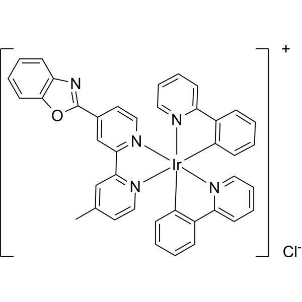 | 生物活性 | NecroIr1 is an iridium(III) complex, serves as necroptosis inducers in Cisplatin (HY-17394)-resistant lung cancer cells (A549R). NecroIr1 selectively accumulates in mitochondria, leading to oxidative stress and loss of mitochondrial membrane potential (MMP). NecroIr1 activates receptor-interacting serine-threonine kinase 3 (RIPK3) and Mixed Lineage Kinase (MLKL), and regulates CDK4 expression. | ||||||||||||||||
