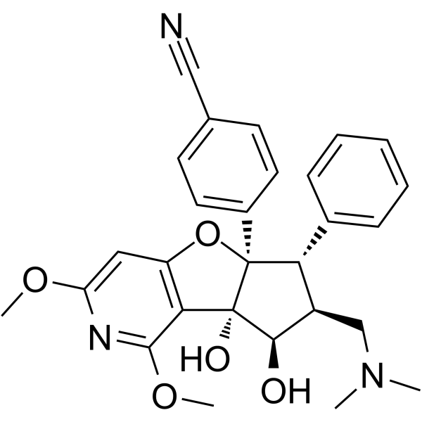 | 生物活性 | Zotatifin (eFT226) is a potent, selective, and well-tolerated eIF4A inhibitor. Zotatifin promotes eIF4A binding to specific mRNA sequences with recognition motifs in the 5’-UTRs (IC50=2 nM) and interferes with the assembly of the eIF4F initiation complex. Zotatifin shows robust antiviral effects, it effectively reduces viral infectivity by inhibiting SARS-CoV-2 NP protein biogenesis (IC90=37 nM). Zotatifin induces cell apoptosis. | ||||||||||||||||||||||||