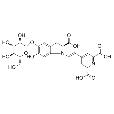 Betanin 具有有效的抗氧化和抗炎活性,能够抑制过氧亚硝基 (ONOO-),其 IC50 值为 19.2 μM。Betanin 是从甜菜中提取的红色糖苷,可用作着色剂。