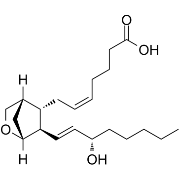 U-46619(1nm-10μM)引起血小板形状改变和聚集,且呈浓度依赖性,EC50s分别为0.58μM和0.013μM,用于聚集和形状改变。U-46619(10nm-10μM)以类似浓度依赖性的浓度依赖性方式增加内部Ca2+浓度([Ca2+]i)并激活磷酸肌醇(PI)水解。U-46619(3nm-10μM)还依赖于血小板膜中GTPase的浓度激活。U-46619通过激活p38MAPK和ERK1/2信号通路提高人诱导多能干细胞向内皮细胞分化的效率。